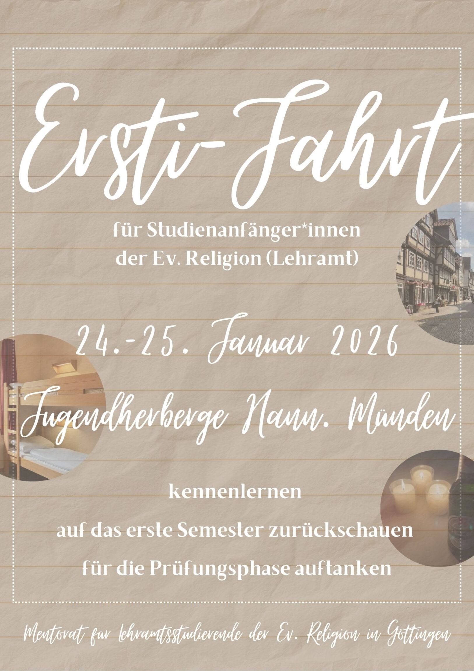 Wir fahren auf Klassenfahrt, äh, Ersti-Fahrt in die Jugendherberge Hann. Münden. Ein Wochenende (24.-25.01.2026) mit Kennenlernen, Rückblick auf das erste Semester und Raum für eure Fragen rund um das Lehramtsstudium erwartet euch.