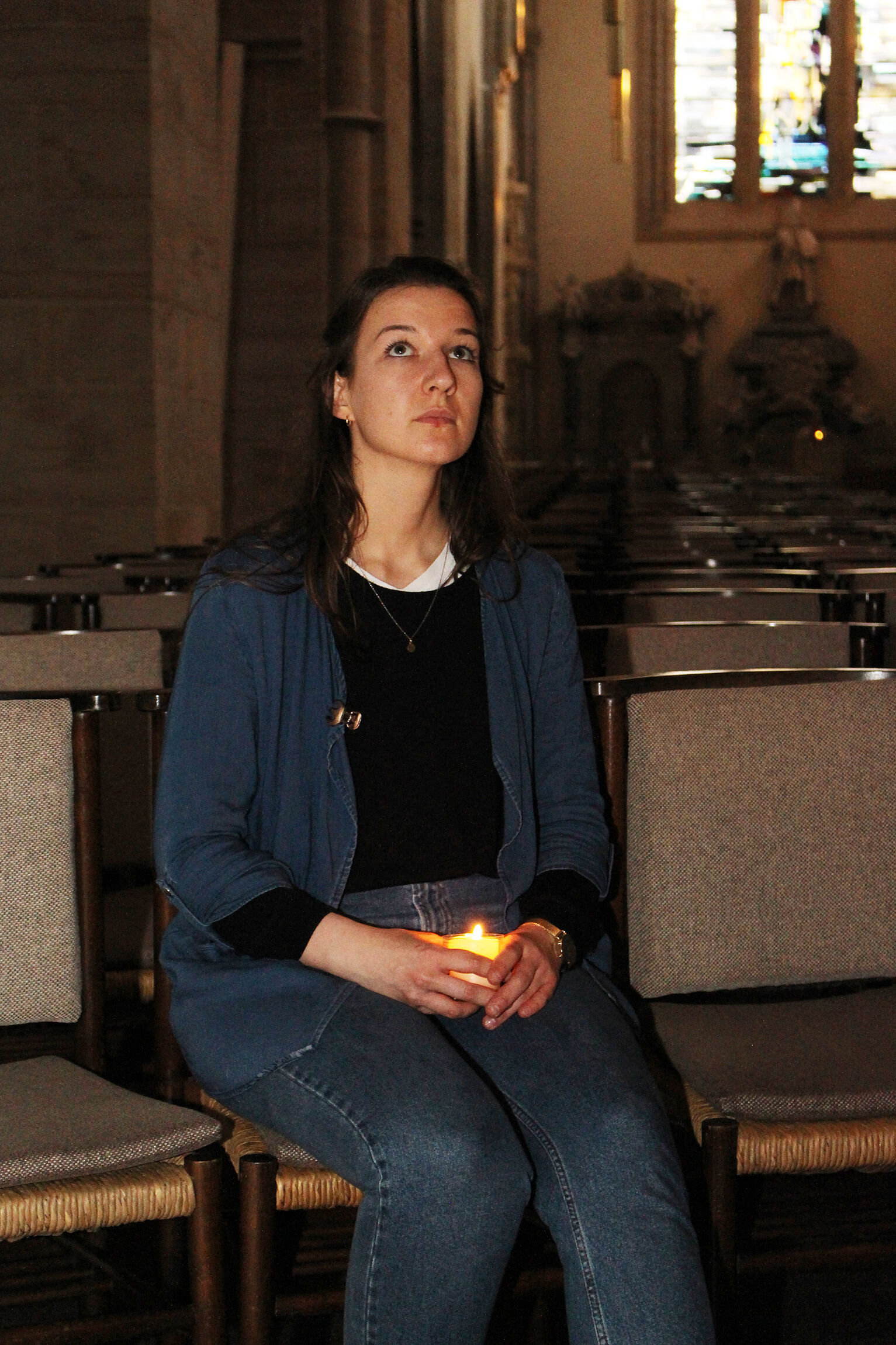 Schweigend betreten die angehenden Religionslehrkräfte die Klosterkirche, jede und jeder mit einer brennenden Kerze in der Hand. Leise und andächtig erkunden sie den Kirchenraum, bis alle ihren persönlichen Lieblingsort gefunden haben. „Mich hat gleich dieses Fenster hier im Chorraum angezogen“, sagt eine Teilnehmerin. Sie steht davor und blickt auf das bunte Fensterglas, durch das ein letzter Rest abendlicher Helligkeit fällt. Andere sitzen in den Stuhlreihen oder sogar auf dem Boden oder stehen vor dem Altar. Später liegen alle auf Matten in der Vierung und betrachten die Kirchendecke. „Ein bisschen, als ob wir Yoga machen würden“, sagt jemand und schmunzelt.